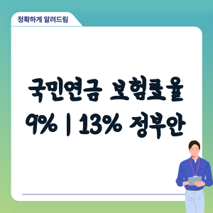 정부는 국민연금 보험료율을 현행 9%에서 13%로 4%p 인상하는 개혁안을 발표했습니다. 이는 연금 재정 안정화를 위한 핵심 조치로 볼 수 있습니다.