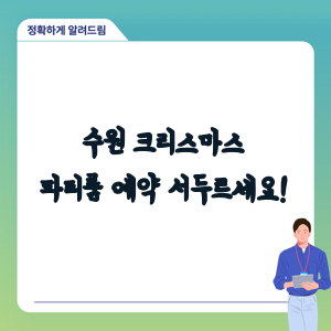 이처럼 수원 지역에는 크리스마스 분위기를 내기 좋은 다양한 파티룸이 있으며, 예약 시 다양한 혜택도 제공되고 있습니다. 연말 모임이나 파티를 계획하고 계신다면 서둘러 예약하시는 것이 좋겠습니다.