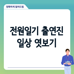 전원일기에는 다양한 출연진들이 등장합니다. 주요 출연진으로는 이서진, 이유영, 이상윤, 이하늬, 김혜윤 등이 있습니다. 이들은 각자 다른 성격과 배경을 가진 인물들로, 시골 마을에서 펼쳐지는 일상을 통해 관객들에게 재미와 감동을 선사하고 있습니다.